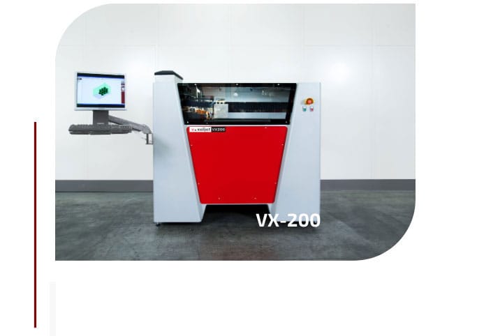 Parâmetros livres e operação simples: a VX200 oferece o mais alto grau de flexibilidade em termos de desenvolvimento de materiais na série de sistemas voxeljet. Seja para novas combinações de aglutinantes e pós ou para a produção rápida de componentes para testes de propriedades, o software de código aberto voxeljet permite que os parâmetros do processo sejam adaptados a materiais de impressão 3D específicos. Graças ao processo de impressão 3D Binder Jetting altamente produtivo, você economiza na otimização de materiais e pode implementar iterações iniciais de design de forma mais rápida e econômica.